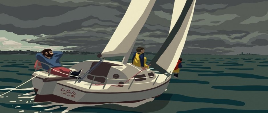 Impossible de passer sous silence la facture visuelle du film, le graphisme et ses à-plats de peinture mate aux éclats contrastés (le gris du ciel, le jaune et le rouge des tenues et… des flammes !) donnant un style classieux, loin d’une esthétique de BD qui aurait pu aisément être adoptée pour cette comédie existentielle. Existentielle, car la morale est que la “belle vie” (également le nom de baptême de l’embarcation et celui de l’imparable balade de Sacha Distel accompagnant le générique de fin), c’est de continuer à avancer, ensemble. Particulièrement vrai en cette période, donc.