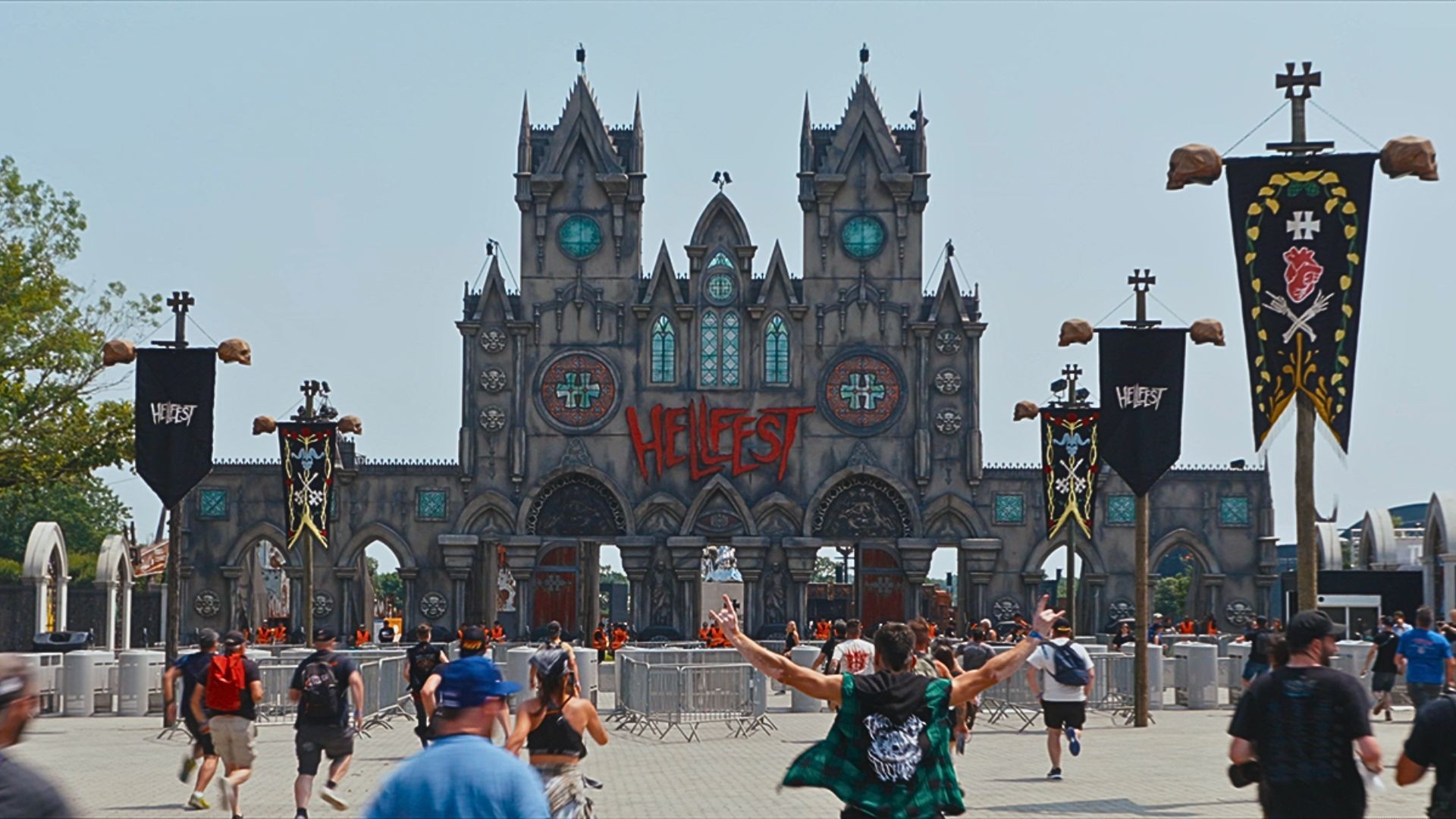 Bientôt, c’est une marée d’hommes et de femmes qui progresse sur une voie rapide, entre The Walking Dead et un pèlerinage. Arrivé sur place, un chanteur lève les bras en croix devant une foule compacte. Au loin, on aperçoit les lettres géantes de la “War Zone”, scène alternative emblématique du festival. L’image est à la fois dérisoire et sacrée : le Hellfest est filmé comme un autel moderne, un lieu de passage et d’allégresse.