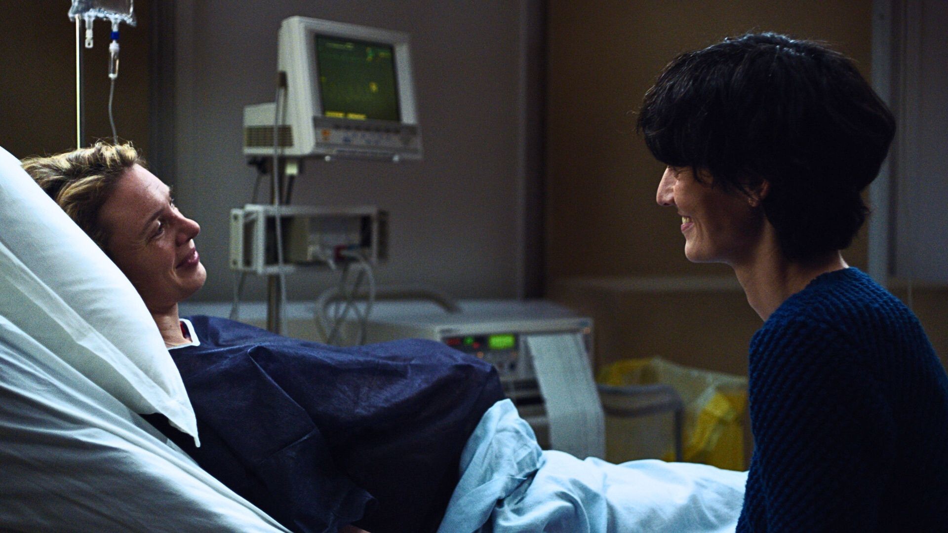 Le film épouse le point de vue de Céline, celle des deux qui n’est pas enceinte. Sous la lumière blafarde des néons de l’hôpital, elle cherche sa place et se questionne sur sa légitimité à devenir mère. Par la rencontre successive de futurs pères – eux aussi relégués au rang de spectateurs –, elle se prête à la confidence, comme un moyen de rompre l’isolement auquel ils sont tenus.