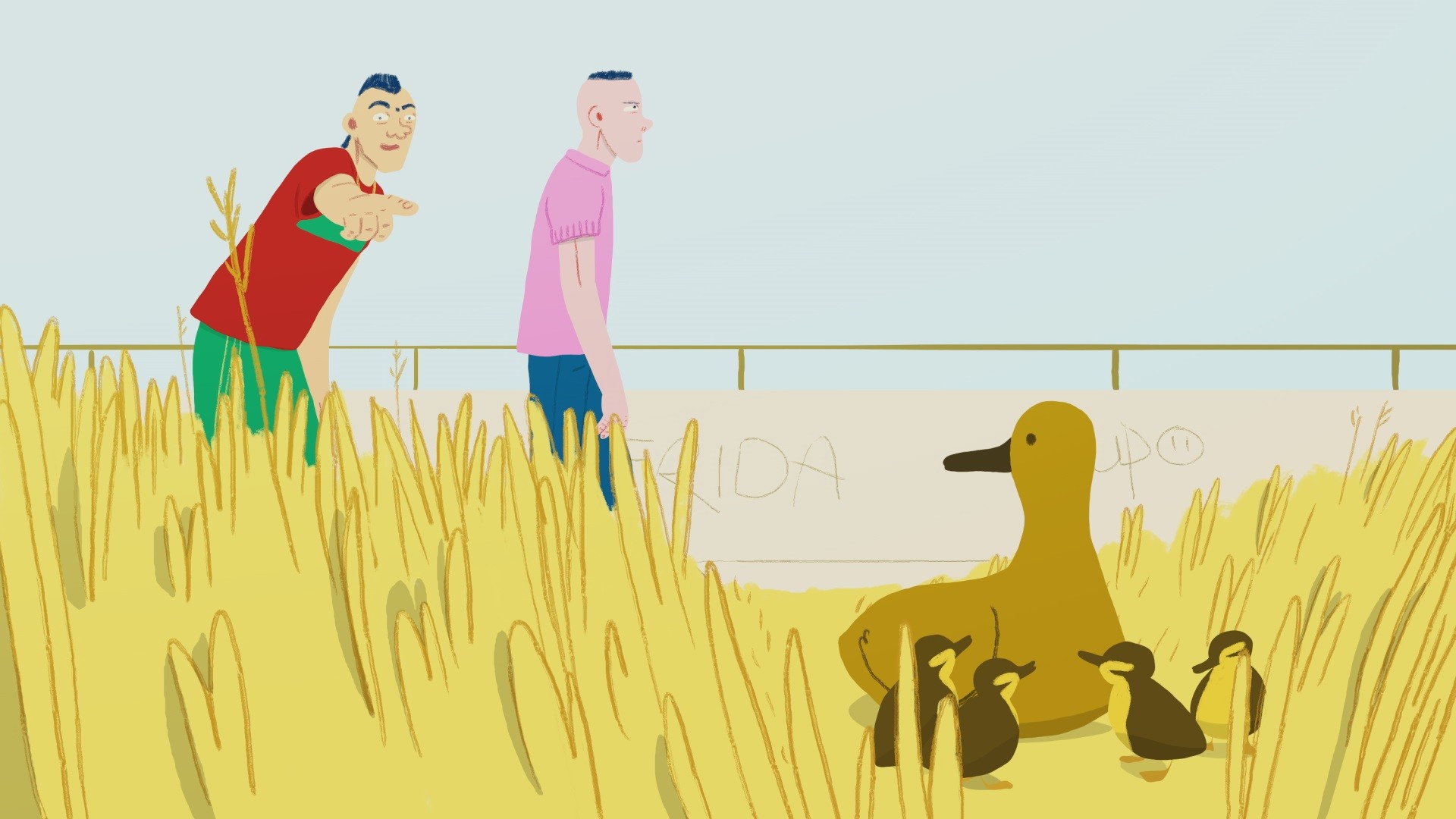 Une comédie tendre avec deux lascars en mode sauvetage animalier, et tout ça en animation. C’est le pari de Loïc Espuche avec ce film de fin d’études réalisé à l’école de la Poudrière de Bourg-lès-Valence. Il s’est inspiré de la véritable découverte estivale, avec un copain, d’une cane et de ses petits, dans la cité de la bande dessinée à Angoulême. C’est là qu’il a étudié auparavant à l’école des Métiers du Cinéma d’Animation (EMCA), où il a coréalisé Le zizi à Suzy et Je repasserai dans la semaine. De ce matériau réel est née une fiction. Le ton est donné dès le début. Ça tchatche et ça envoie entre Dimitri et Fabio, deux potes qui vont rejoindre au bar à chicha celle qui fait craquer le premier. Il en pince grave et veut l’épater pour la séduire. Le regard du réalisateur sur ses personnages est complice et amusé. Il transforme une scène de quotidien en cité en une échappée drolatique et poétique. Dans le rapide et tordant Le zizi à Suzy, il filmait avec Xavier Sailliol un moment de drague enfantine, où une tierce gamine cafteuse semait la zizanie. Dans l’émouvant Je repasserai dans la semaine, il captait avec Alizée Cholat et Sophie Devautour l’amitié d’une paire de jeunes gars, rapprochés par la mort du grand-père de l’un d’eux. Point commun : un humanisme et une bienveillance, sans chichis, qu’on retrouve ici. Le copieux échange verbal initial laisse transpirer la loyauté du binôme et sa solidarité. Les jeux de langage rythment la narration et donnent du relief à l’objectif, qui devient une obsession : réunir la petite famille volatile. “Oh, mais tu sais c’que c’est de grandir sans maman ?!” s’énerve Fabio. “J’vais pas niquer mon polo pour des canetons !” s’offusque Dimitri. Action-réaction, entre burlesque et suspense. Le graphisme simple, fin, garni de couleurs vives, apporte une énergie rafraîchissante. Fraîcheur qui domine, dans la spontanéité comme dans la construction. Espuche croque un monde et joue avec ses codes, celui d’un quartier de “téci” le long d’un fleuve, où les déclarations murales (“69 la trik”) se mêlent au lave-linge et cannette abandonnés. Une alchimie simple, singulière et efficace, qui a valu à l’aventure le Prix du public des films d’école européens au Festival Premiers Plans d’Angers en 2016. Et une alliance d’amitié tendrement virile, que le réalisateur devrait approfondir dans son prochain opus : Les nouveaux hommes.